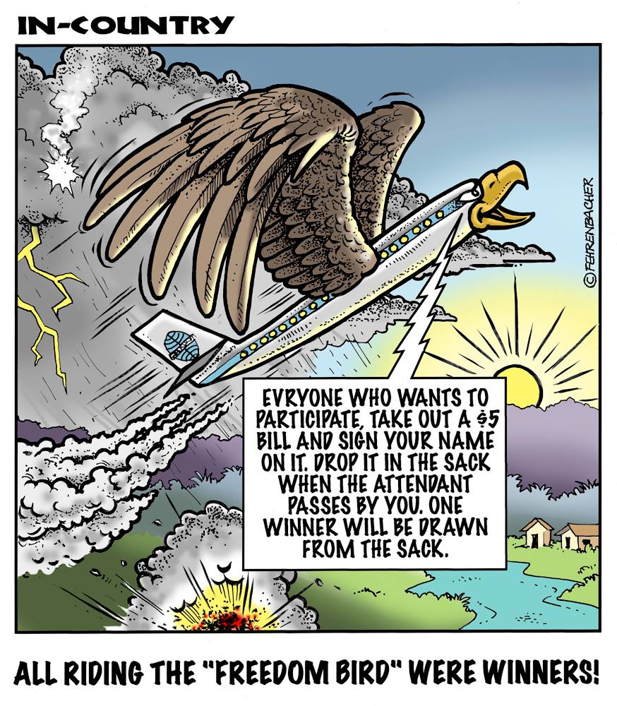 Phil enlisted in the Army in 1965 where you served for years in Vietnam.  He became a graphic designer and has worked for the state of Oregon for 26 years.  He retired in 2003 and started the Cartoon "In-Country".  The cartoons reflect his experiences during his tour of duty in South Vietnam.
