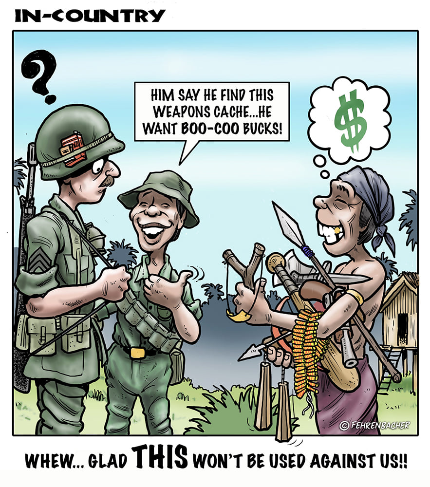 Phil enlisted in the Army in 1965 where you served for years in Vietnam.  He became a graphic designer and has worked for the state of Oregon for 26 years.  He retired in 2003 and started the Cartoon "In-Country".  The cartoons reflect his experiences during his tour of duty in South Vietnam.