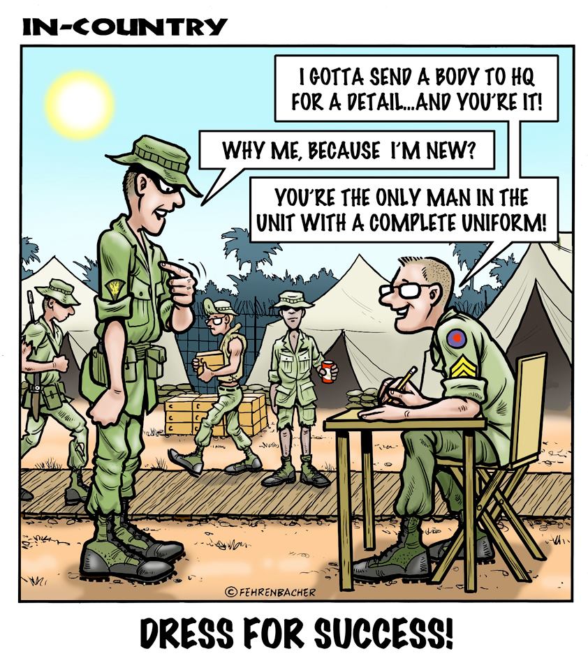 Phil enlisted in the Army in 1965 where you served for years in Vietnam. He became a graphic designer and has worked for the state of Oregon for 26 years. He retired in 2003 and started the Cartoon "In-Country". The cartoons reflect his experiences during his tour of duty in South Vietnam.